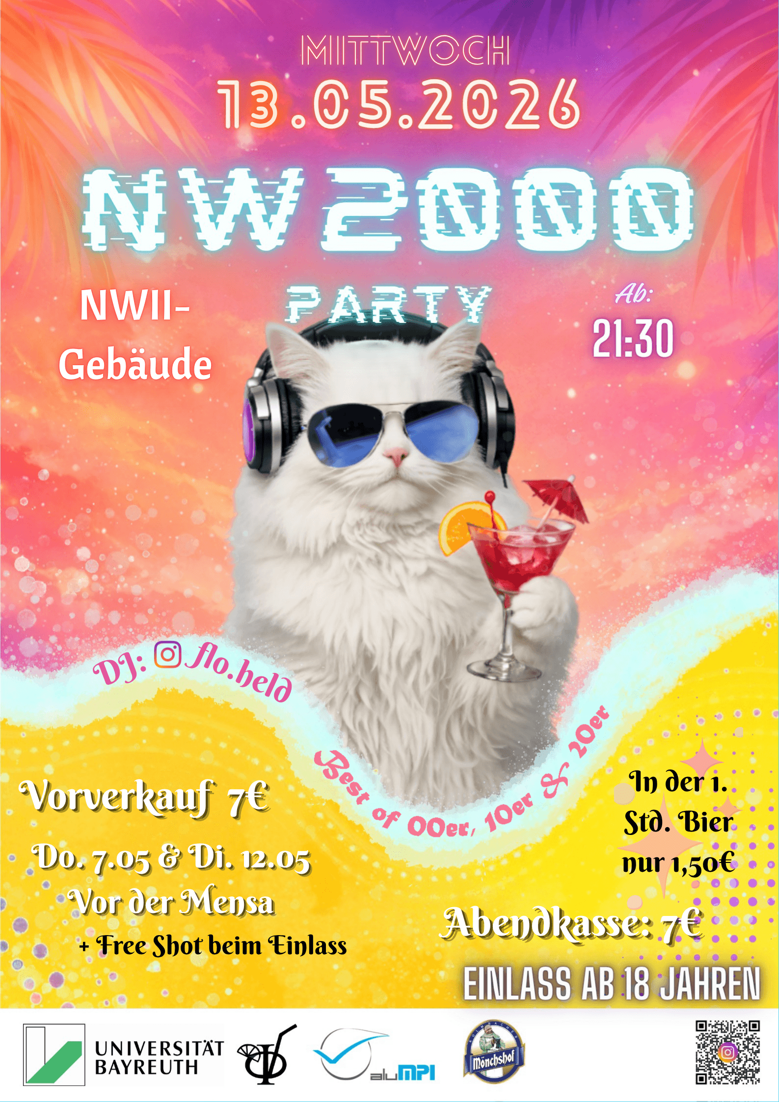 Am 13.Mai findet endlich wieder eine Party im NWII Gebäude statt. Auch dieses Semester feiern wir unter dem Motto NW2000-Party mit euch!