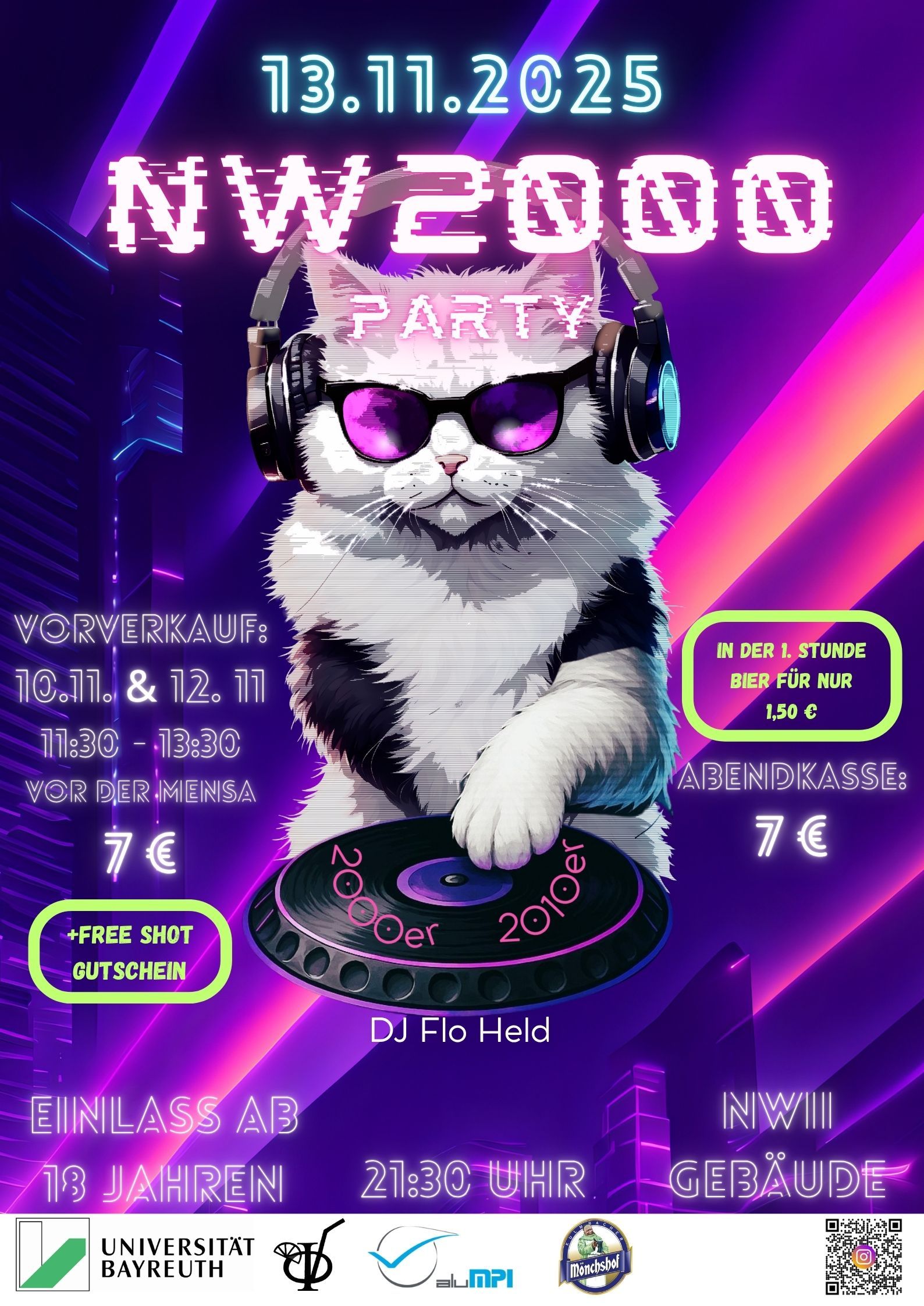 Am 13.November findet endlich wieder eine Party im NWII Gebäude statt. Auch dieses Semester feiern wir unter dem Motto NW2000-Party mit euch!